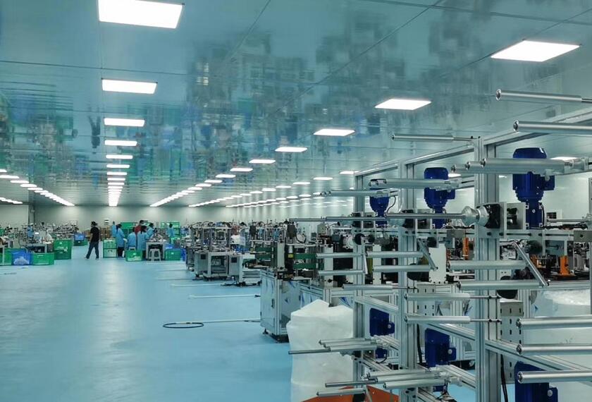 一個標準的口罩廠無塵凈化車間系統構成主要由天花吊頂系統、空調系統、配電系統、隔墻系統、地板面、配電照明系統這五大部份組成。天花吊頂系統包括綱梁、吊桿、天花板格子梁;空調系統包括風管、過濾器系統、主機、FFU等;隔墻系統包括門、窗戶等。